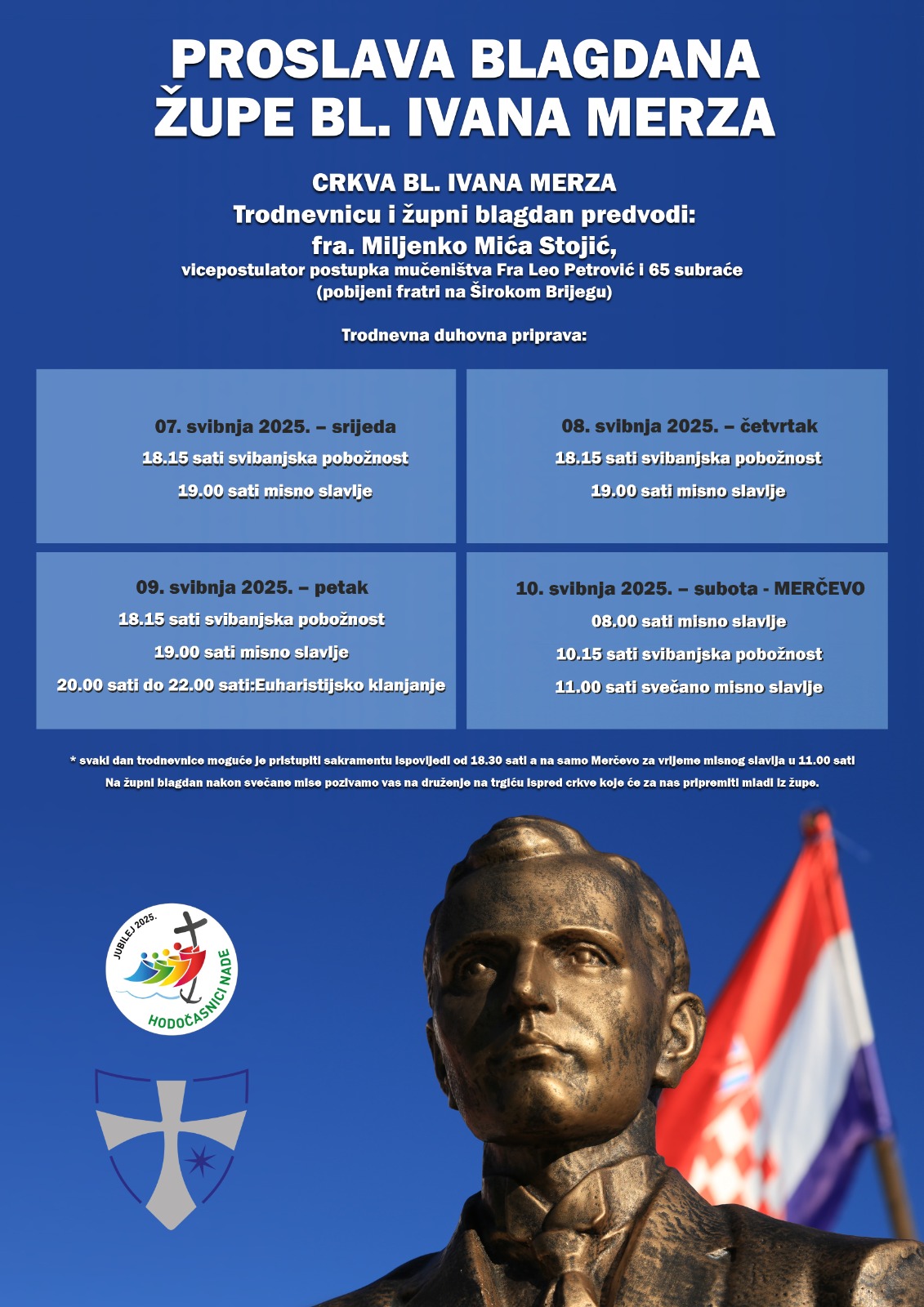 09. svibnja 2025. petak: 18.15 sati svibanjska pobožnost, 19.00 sati misno slavlje, 20.00 sati do 22.00 sati Euharistijsko klanjanje
